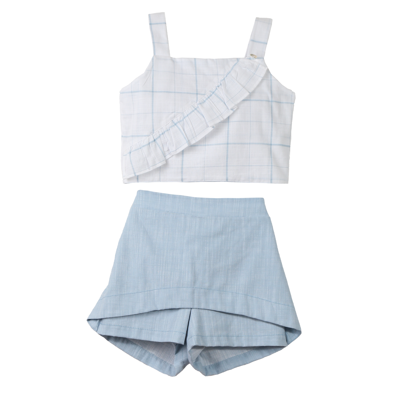 Conjunto infantil em tecido de algodão, blusa decote reto, alças, babado frontal assimétrico. Abotoamento nas costas. Short-saia com elástico nas costas, soltinho e confortável.