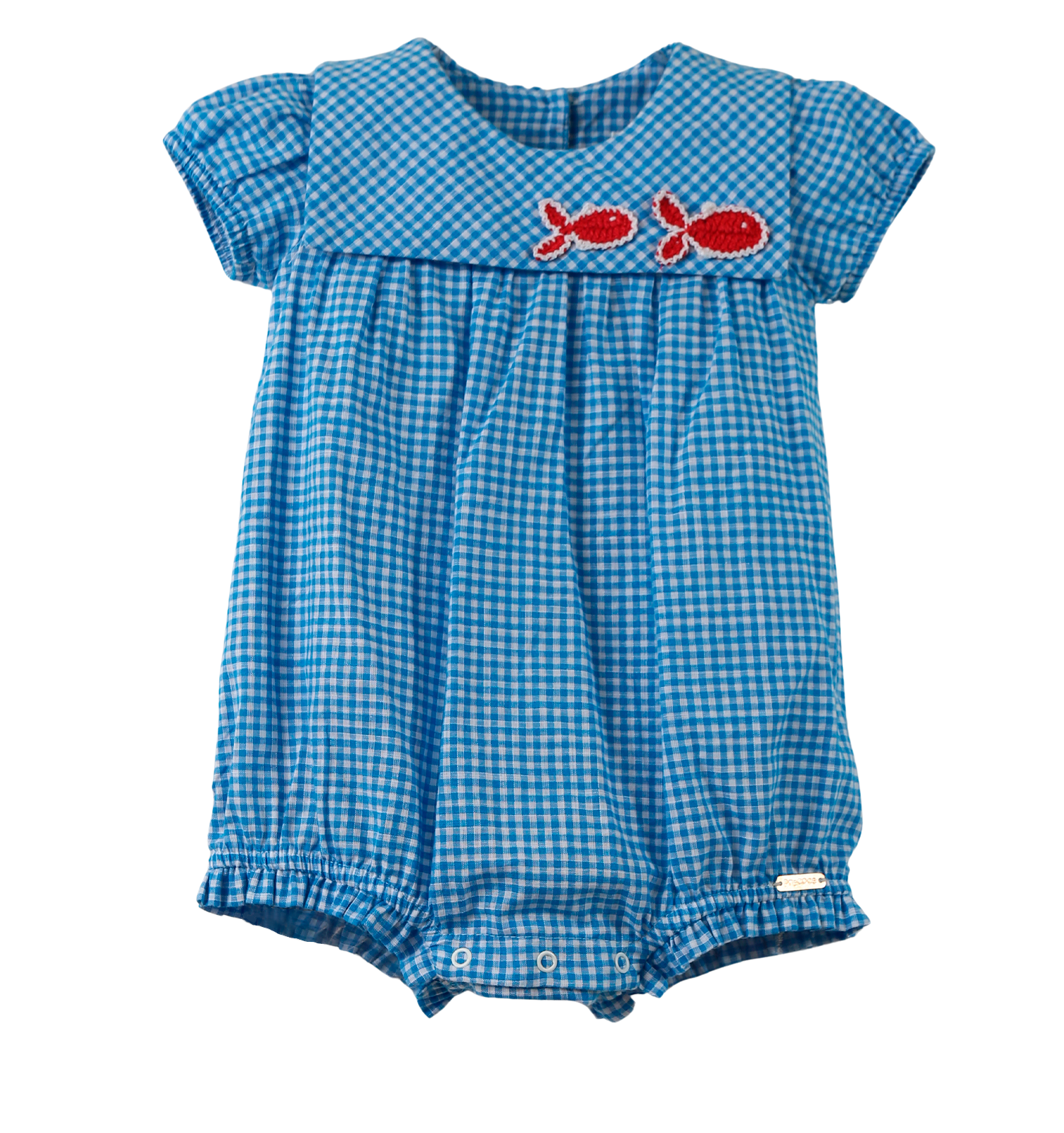Macacão infantil em tecido de algodão, gola marinheiro com bordado de crochê peixe, manga fofa com elástico, abotoamento nas costas e entre as pernas.
