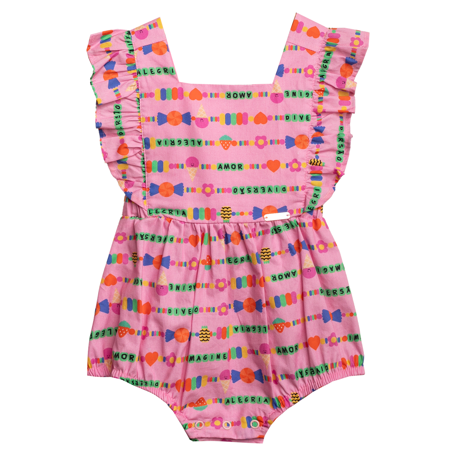 Macacão infantil feminino em tecido de algodão, decote quadrado, pala média com recortes e babadinho que vai até as costas formando um decote cruzado. Para mais conforto ele possui abotoamento e elástico entre pernas. Feito com a nossa estampa exclusiva “PULSEIRINHAS DIVERTIDAS“.