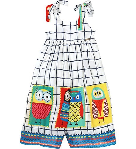 Macacão pantacourt de algodão, soltinho, estampa barrado coruja quadriculado, botões costas e alça de amarrar.