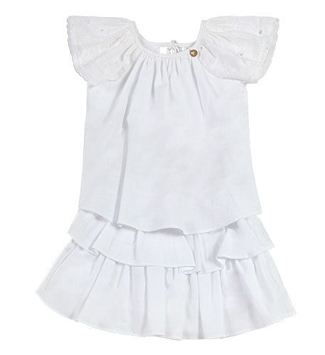 Conjunto infantil, blusa com leve franzido no decote, abinha com dois babadinhos sobre os ombros, viés amarrando nas costas, saia com dois babados sobre short confortável de malha com elastano e elástico na cintura.