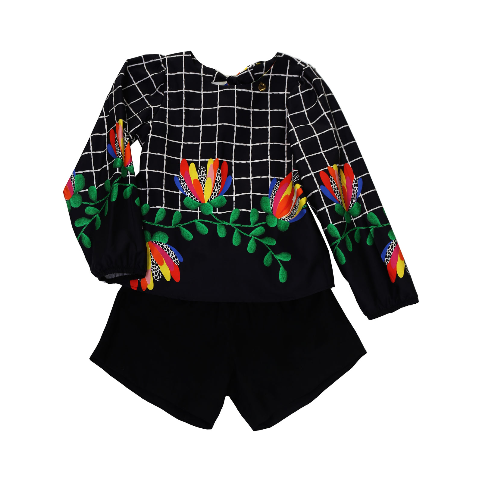 Conjunto infantil, blusa tipo bata, decote nas costas com laço, manga longa, feito na nossa estampa exclusiva “Quadriculados flores patchwork”