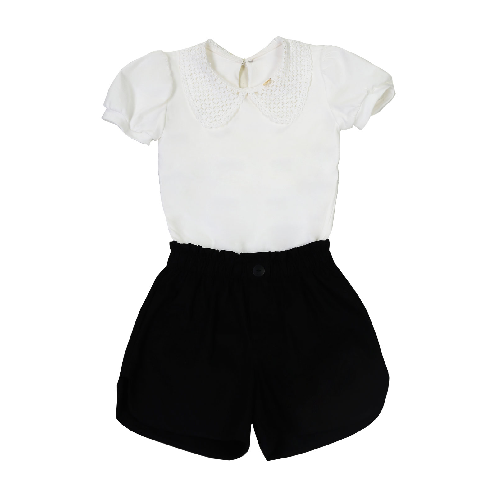 Conjunto feminino, blusa em malha de algodão com elastano, decote U, com gola guipir, mangas fofas, abertura pequena nas costas, short de tecido de algodão, elástico na cintura com babadinho, barra arredondada.