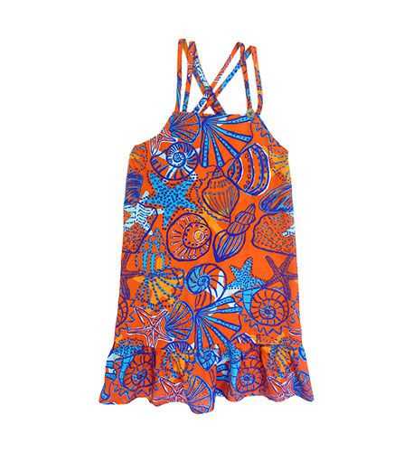 Vestido de viscose, alça dupla, decote costas com alça cruzada e babado barra, com nossa exclusiva estampa "conchas".