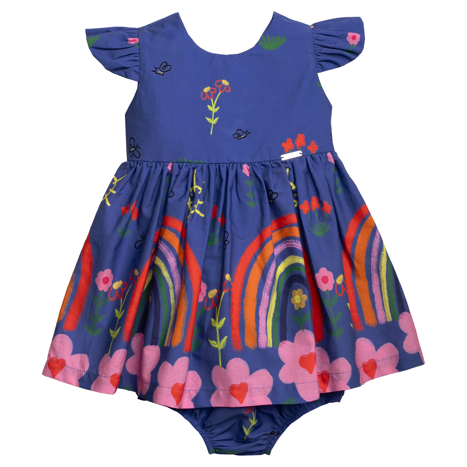 Vestido infantil desenvolvido em tecido de algodão, decote em U, manguinhas de babadinho, pala franzindo e abrindo a roda do vestido, decote nas costas em formato de coração com abotoamento, modelagem soltinha e confortável. Calcinha com elástico na cintura e entre pernas. Feito com a nossa estampa exclusiva “BARRADO DESENHO GIZ DE CERA”.