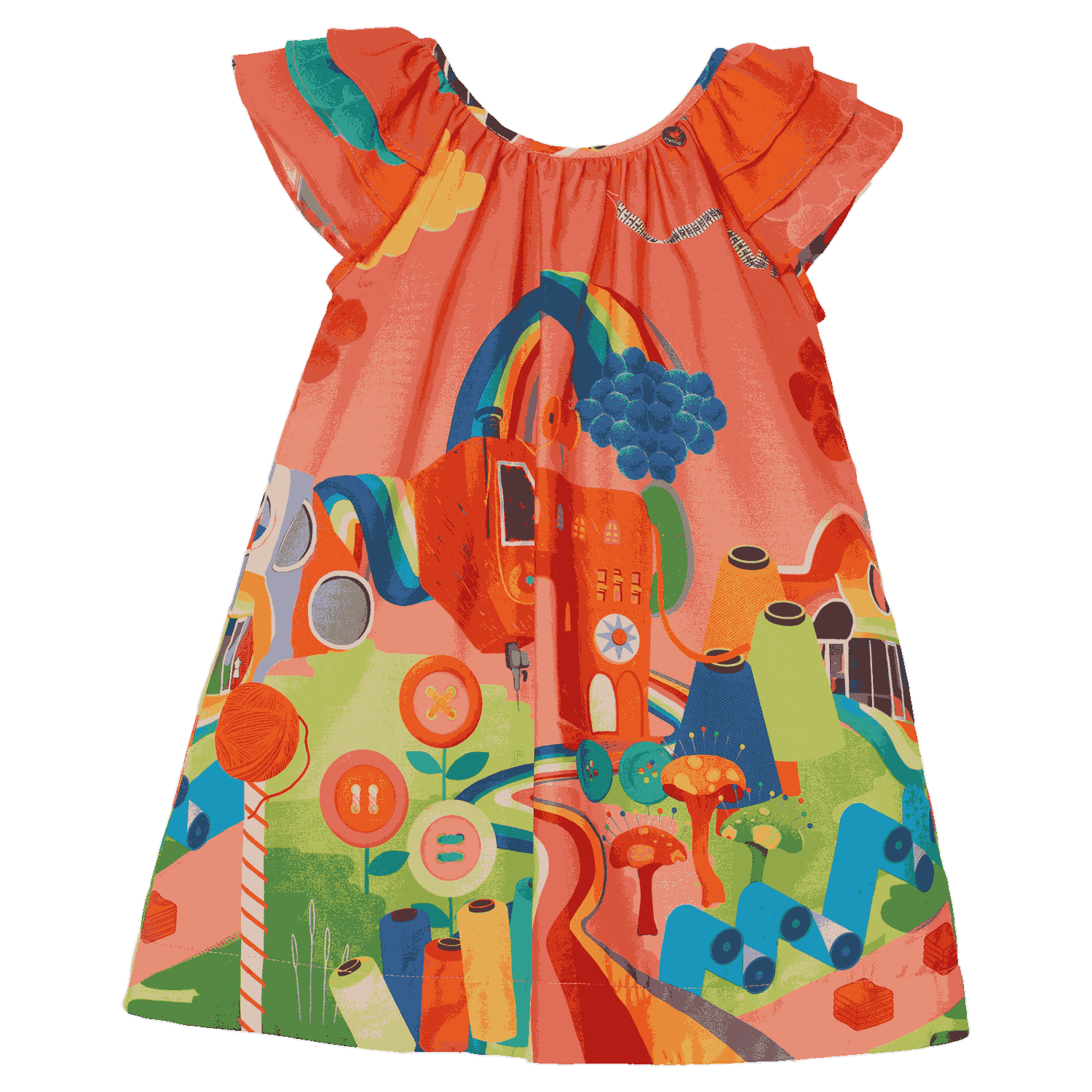 Vestido infantil em tecido de algodão, decote em U, manga com babado triplo, modelagem evasê, abotoamento nas costas. Feito com a nossa estampa exclusiva “BARRADO O FANTASTICO PLANETA PRECOCE”.