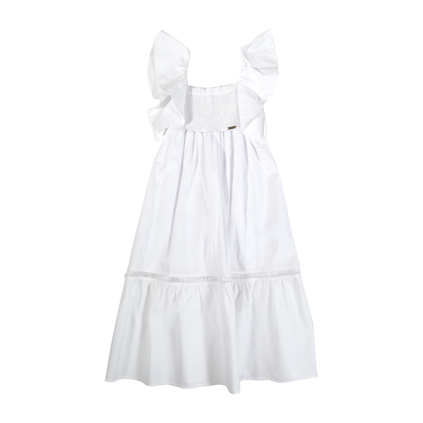 Vestido Infantil em tecido de algodão, decote reto com pala de lastex, saia franzida abrindo a roda, manga borboleta, babado na barra com detalhe de ponto palito, modelagem soltinha e confortável, arrumado para diversas ocasiões.