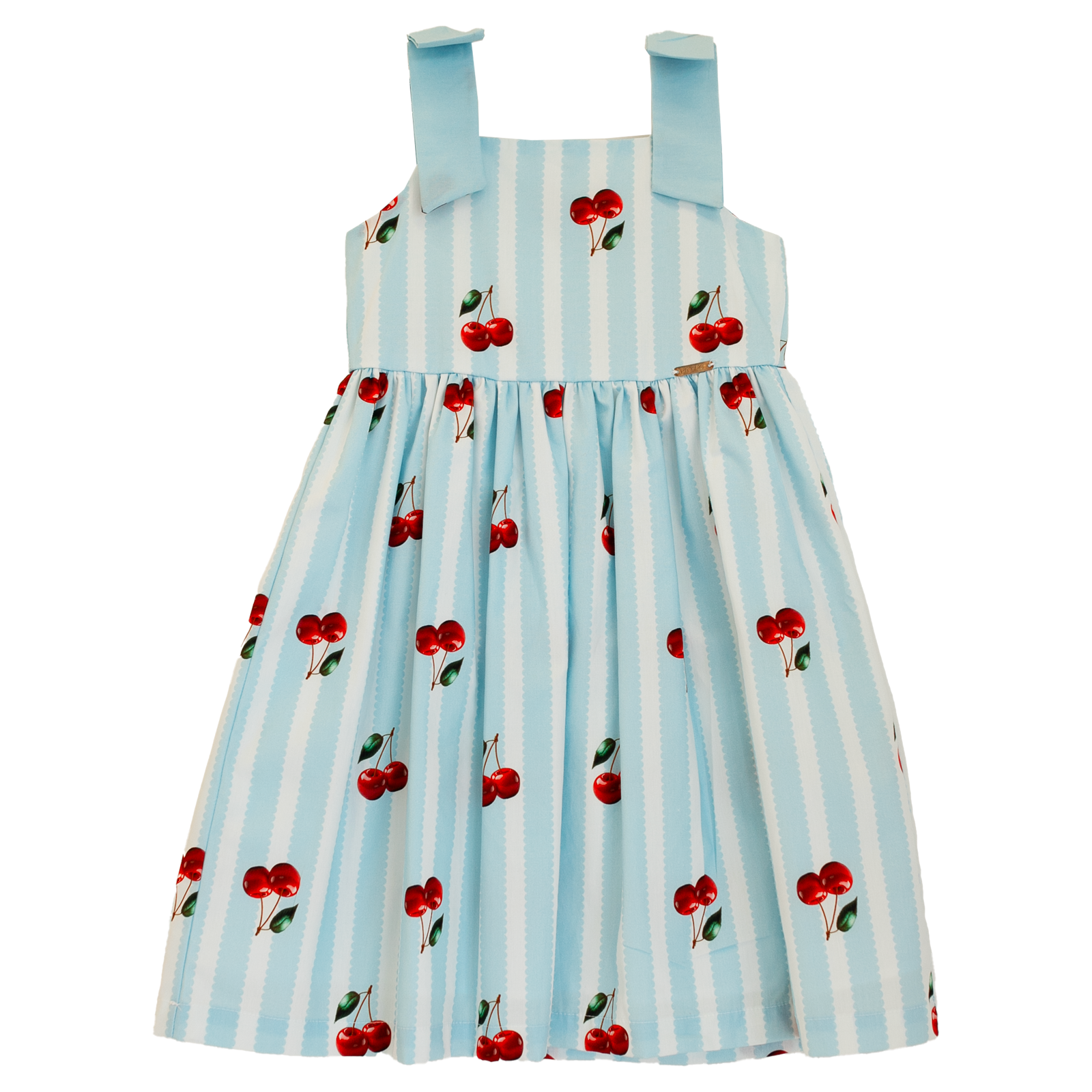 Vestido infantil em tecido de algodão, decote reto, pala, alça com laço, saia rodada e abotoamento nas costas. Feito com a nossa estampa exclusiva “CEREJINHA AZUL CLARO LISTRADA”. A equipe de estilo e design da Precoce tem o cuidado de desenvolver modelos que permitam à criança ser livre para ser criança.