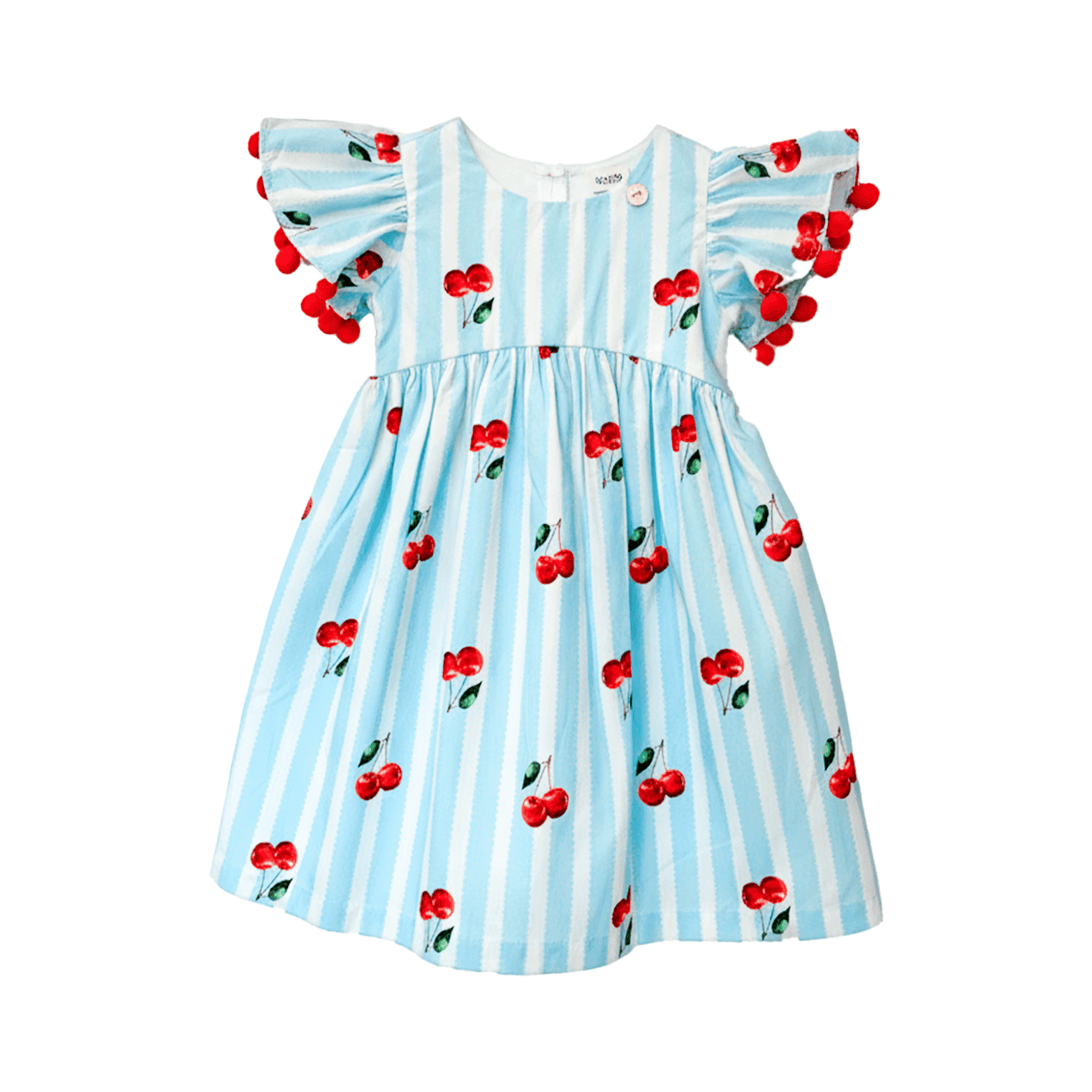 Vestido infantil em tecido de algodão, decote em U, manga franzida com detalhes em pompom vermelho, pala, modelagem, ampla e confortável. Feito com a nossa estampa exclusiva “CEREJINHA LISTRADO”.