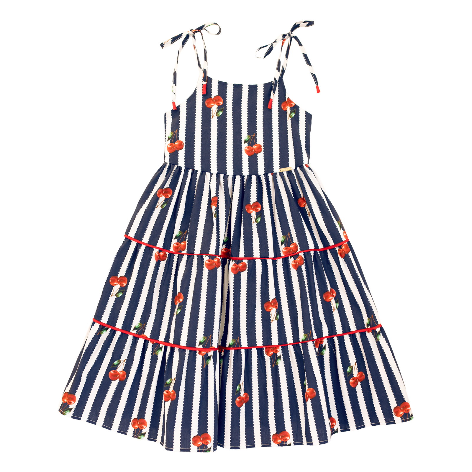 Vestido infantil em tecido de algodão, decote reto, alças de amarrar, pala, cintura marcada, saia com recortes e vivos embutidos, abotoamento nas costas. Feito com a nossa estampa exclusiva “CEREJINHA AZUL MARINHO LISTRADA”.