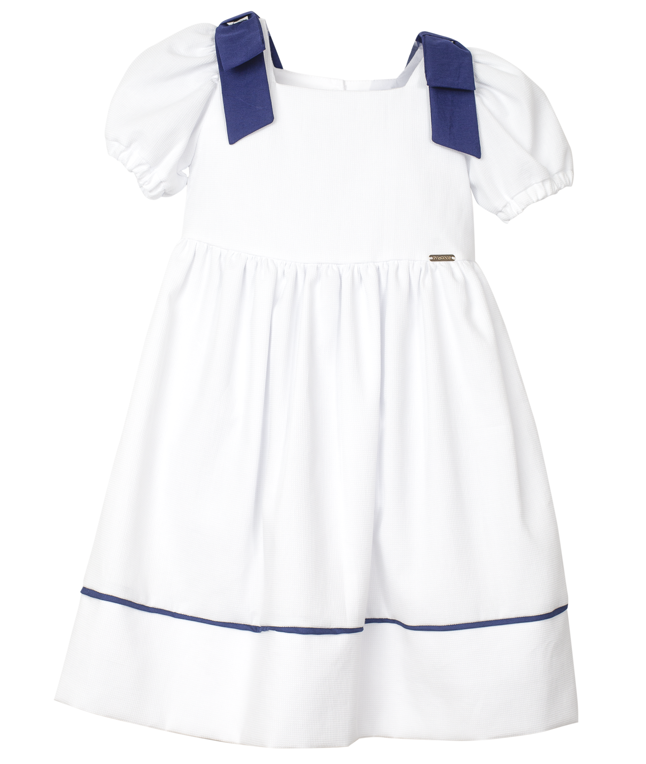 Vestido infantil em tecido de algodão, decote reto, mangas fofas com laço no ombro, pala e cintura marcada, abotoamento nas costas.