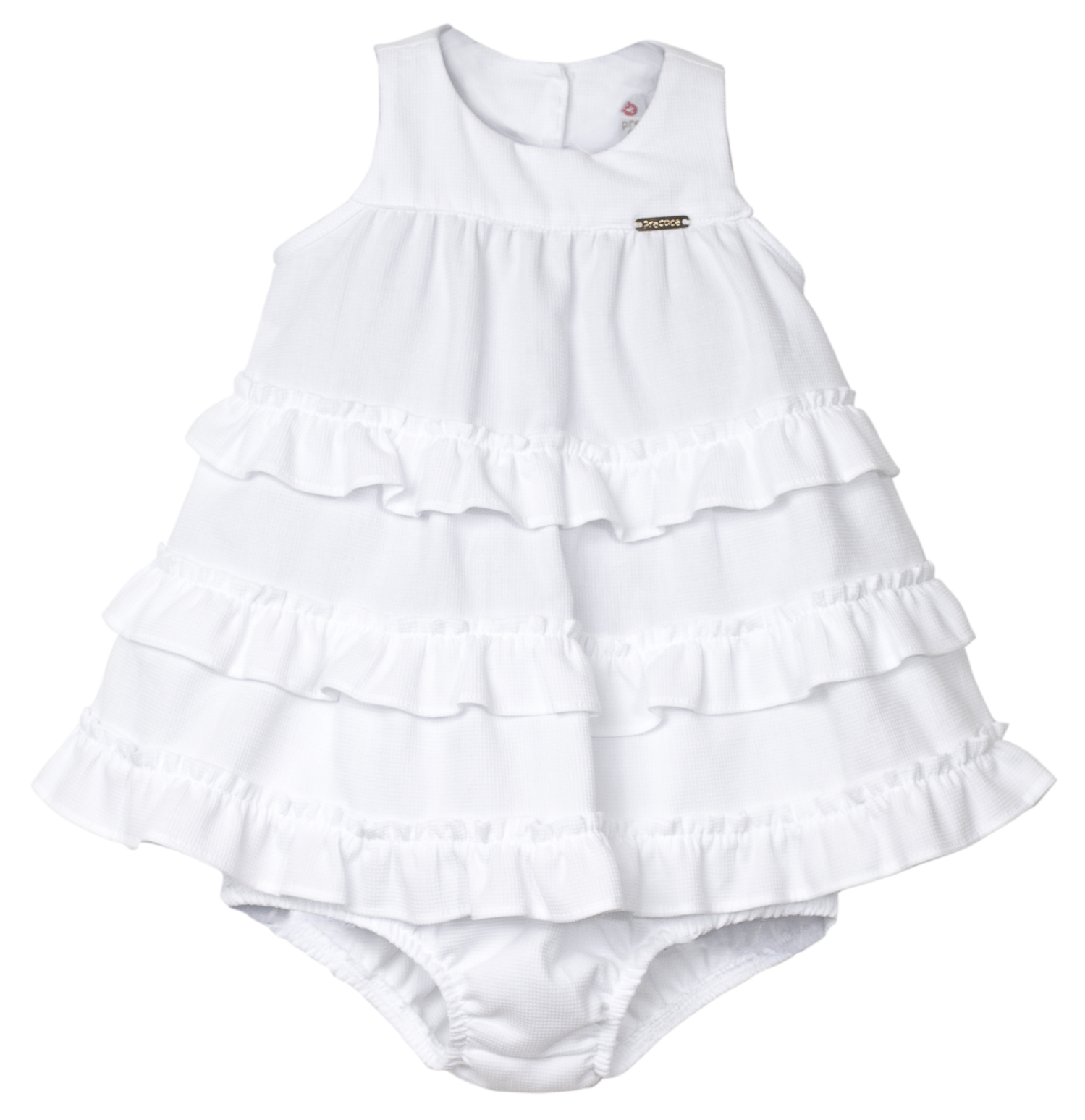Vestido infantil em tecido de algodão, decote em U, pala pequena, babadinhos sobrepostos ao redor do vestido. Abotoamento nas costas.