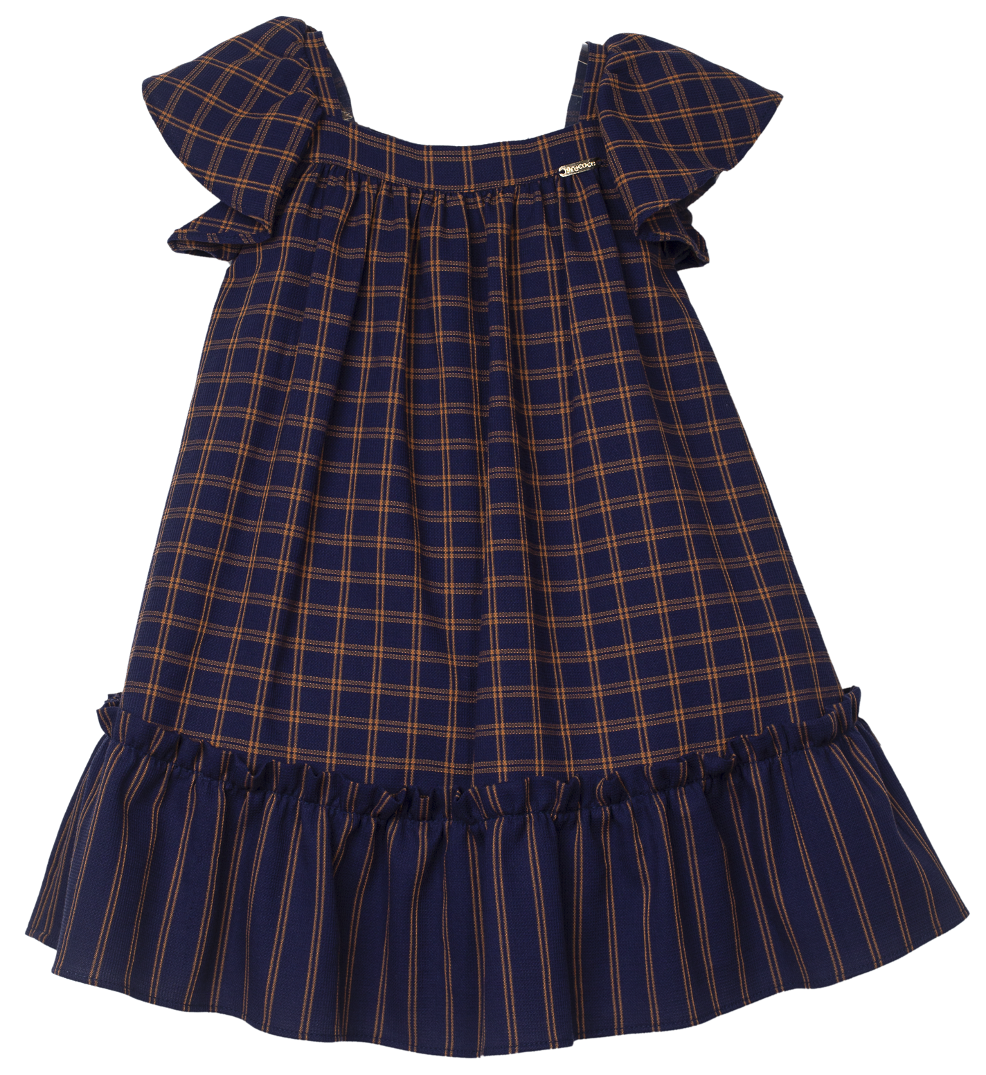 Vestido infantil em tecido de algodão, decote reto mangas amplas, pala pequena franzindo e abrindo a roda do vestido, babado na barra. Abotoamento nas costas.