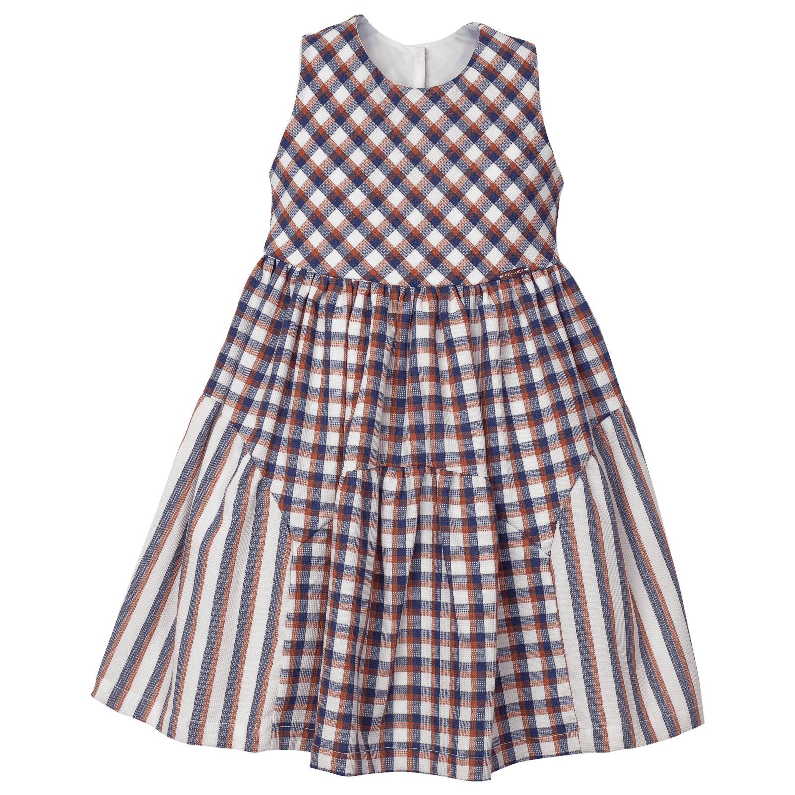 Vestido infantil em tecido de algodão, decote em U, cintura marcada.