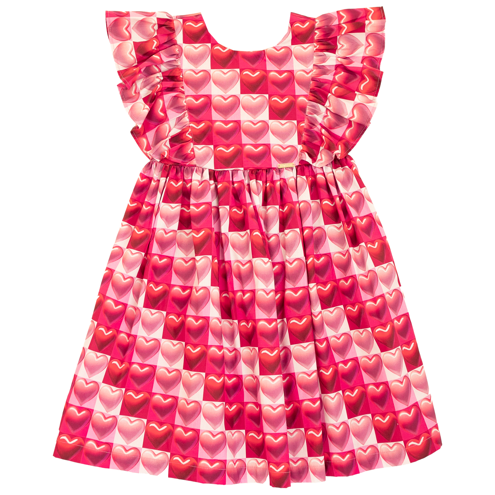 Vestido infantil em tecido de algodão, decote em U, pala com recortes nas laterais e babado embutido nos recortes, cintura marcada, decote de coração nas costas com abotoamento, modelagem confortável. Feito com a nossa estampa exclusiva “BALA DE CORAÇÃO”.