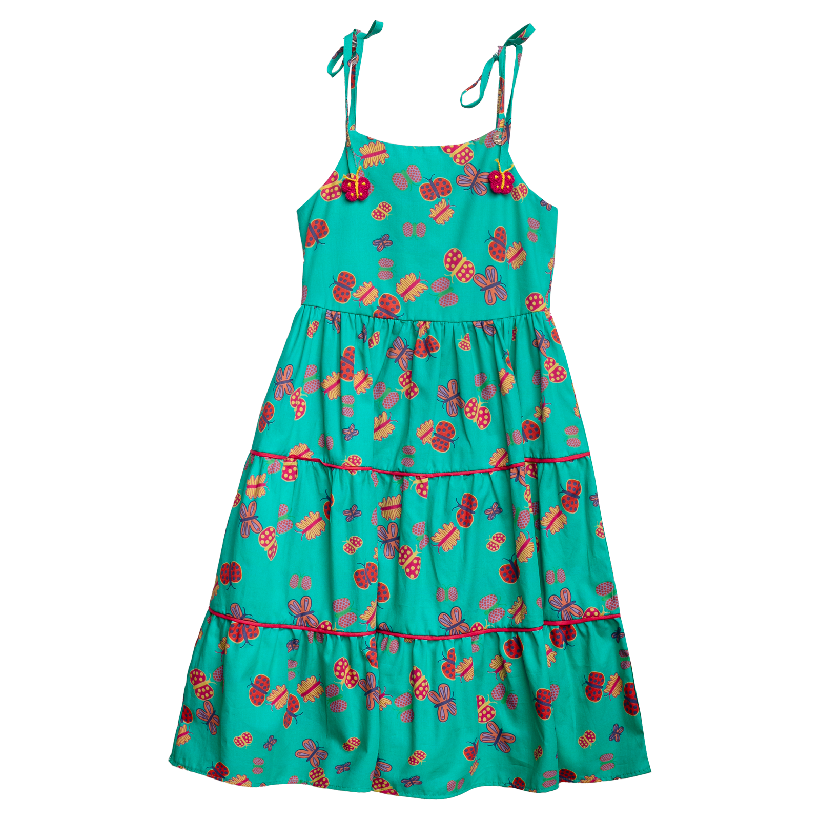 Vestido Infantil em tecido de algodão, decote reto, alças de amarrar sobre os ombros com ponteiras bordadas, pala média, cintura marcada, abotoamento nas costas e detalhes no vivo entre as rodas da saia.