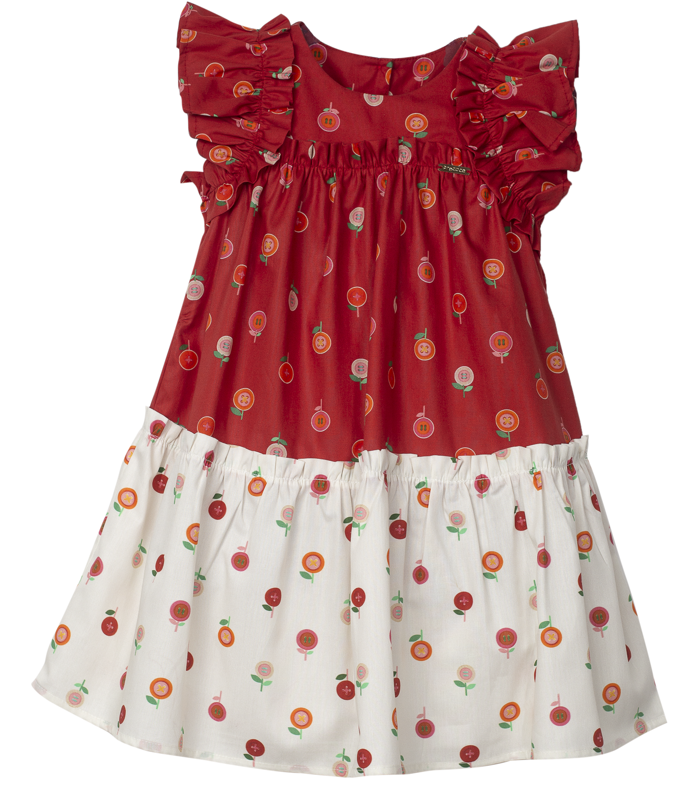 Vestido infantil em tecido de algodão, pala pequena, babado sobreposto na manga e na pala, abotoamento nas costas.