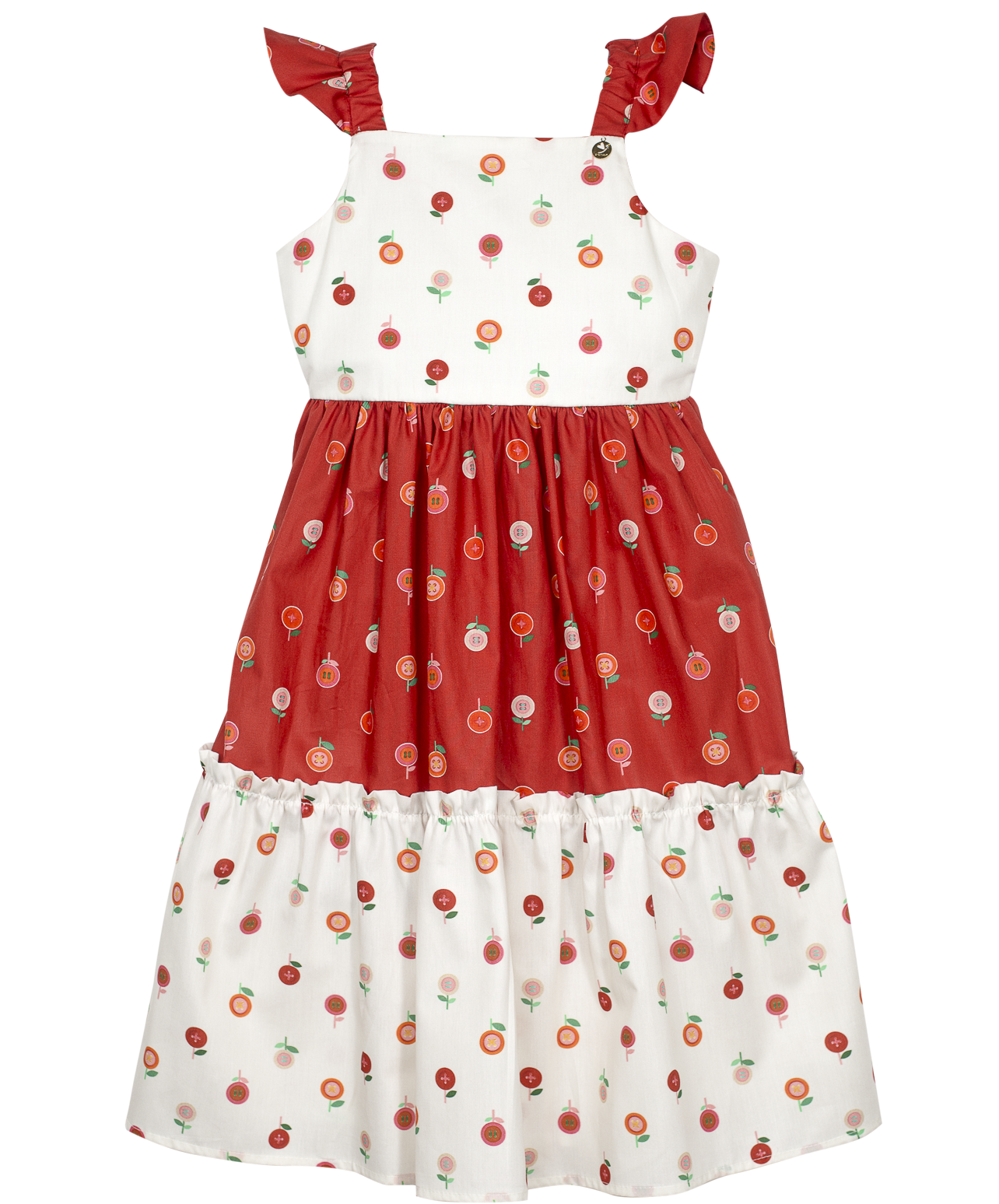 Vestido infantil em tecido de algodão, decote reto, alças elástico e babadinho, pala franzindo e abrindo a roda do vestido, amarração e elástico nas costas.