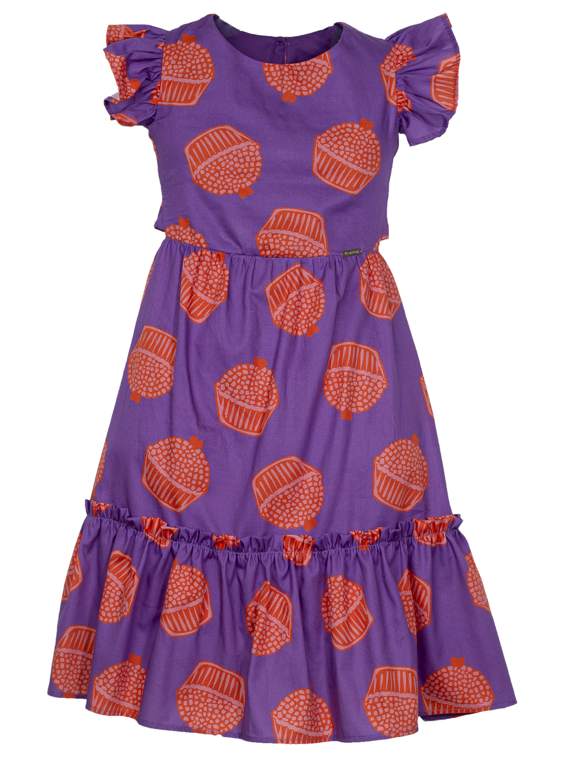 Vestido infantil em tecido de algodão, decote em U, mangas de babadinho, abotoamento e amarração nas costas, babado na barra.