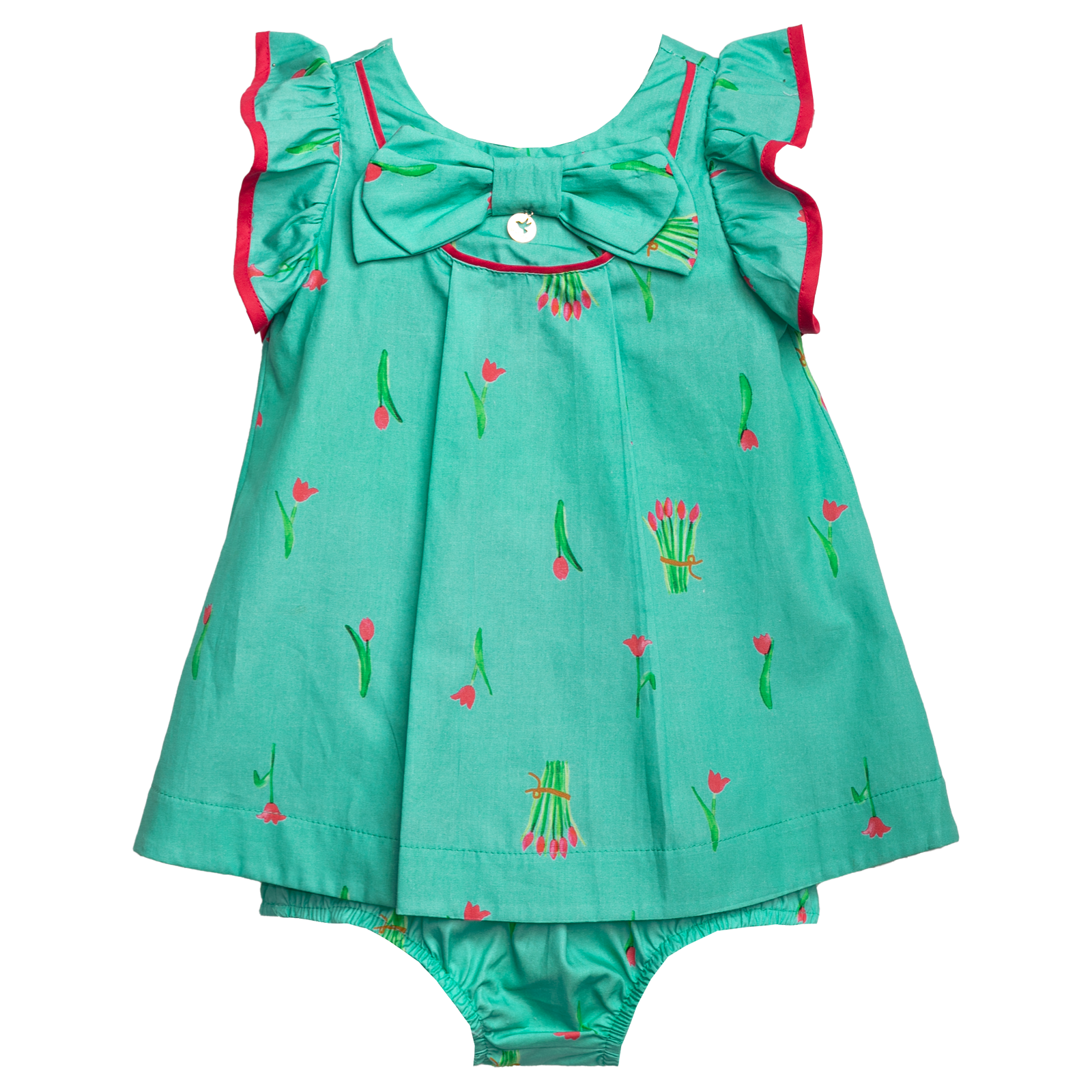 Vestido infantil em tecido de algodão, gola U, com modelagem arredondada na pala, detalhe embutido no vivo rosa e um laço para deixar a peça ainda mais linda, manguinha com viés na barra, saia franzindo e abrindo a roda do vestido, abotoamento nas costas. Calcinha com elástico na cintura e pernas. Feito com a nossa estampa exclusiva “BUQUE DE TULIPAS”.