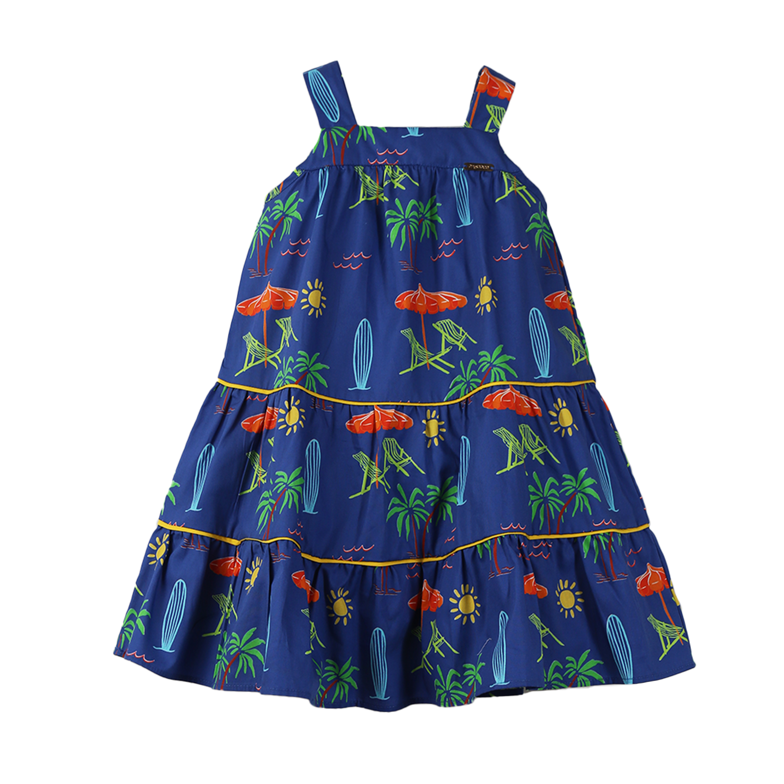 Vestido em tecido de algodão, alça e pala pequena franzindo e abrindo a roda do vestido, saia rodada com recortes e detalhes em vivo, soltinho e confortável, abotoamento nas costas. Feito com a nossa estampa exclusiva “DESENHANDO AS FÉRIAS FUNDO AZUL”.