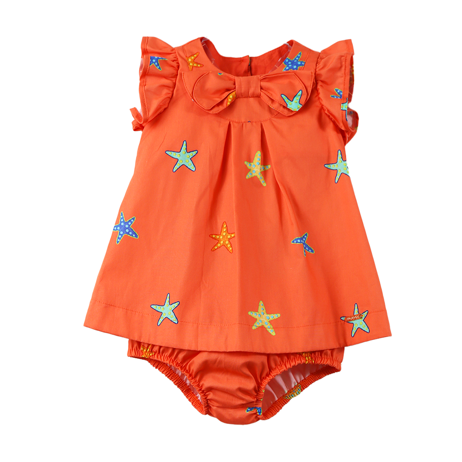Vestido infantil em tecido de algodão, decote em U, pala redonda com laço, manguinhas de babadinho, modelagem evasê, abotoamento nas costas. Calcinha com elástico na cintura e entre as pernas. Feito com a nossa estampa exclusiva “ESTRELA DO MAR”.A equipe de estilo e design da Precoce tem o cuidado de desenvolver modelos que permitam a criança ser livre para ser criança.
