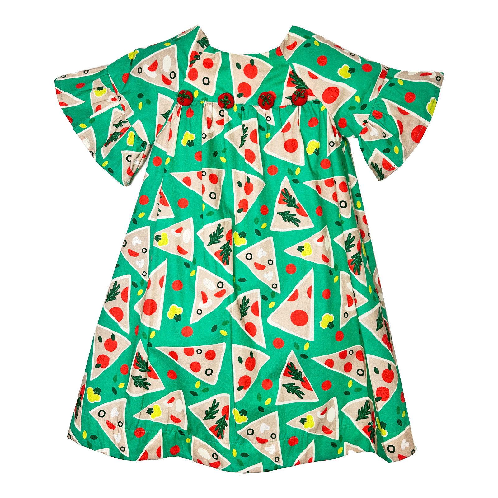 Vestido infantil em tecido de algodão, pala com tomatinhos,, saia com leve franzido abrindo a roda do vestido. Abotoamento nas costas. Feito com a nossa estampa exclusiva “Festa de pizza”.