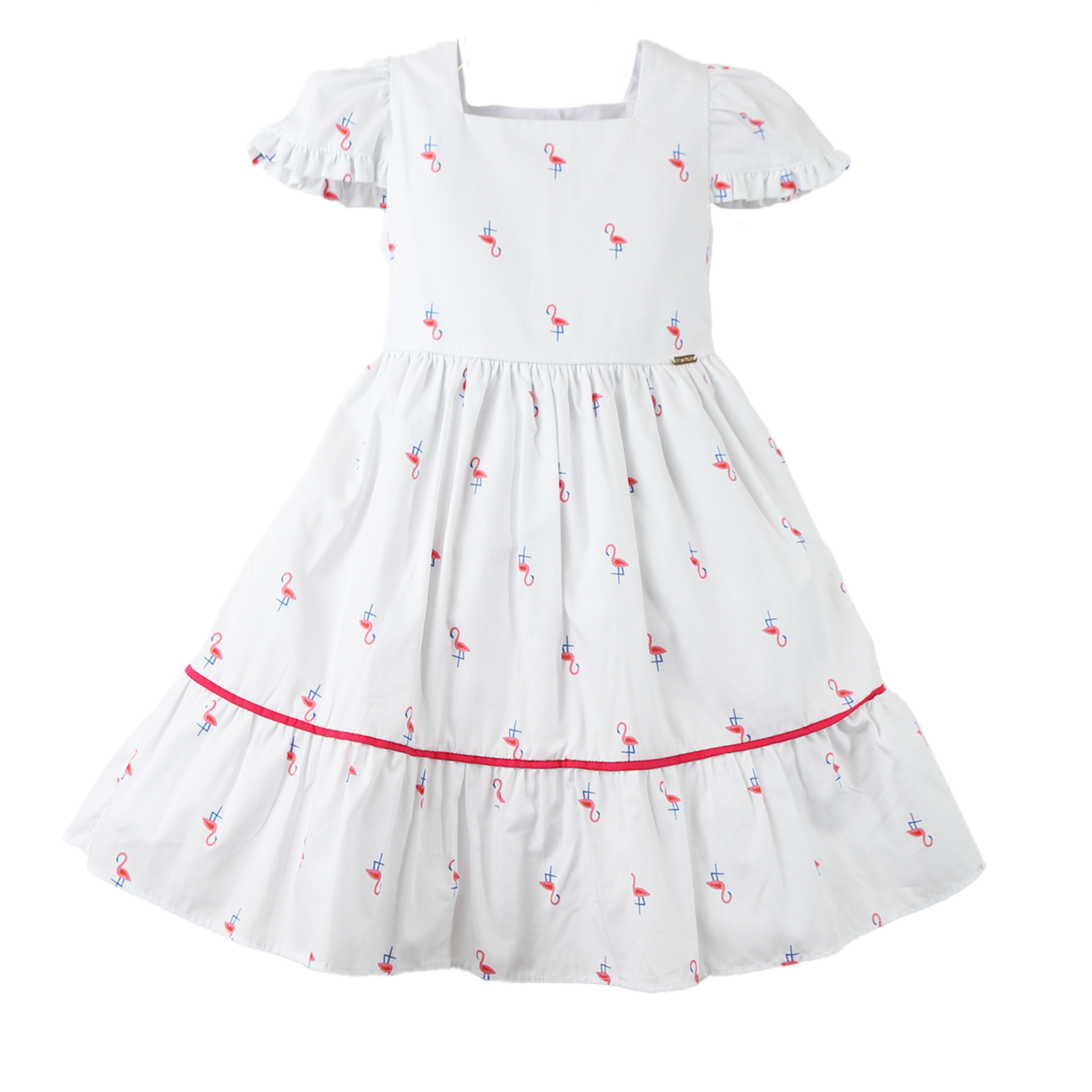 Vestido infantil em tecido de algodão, decote quadrado, cintura marcada, mangas com babadinho, saia rodada com vivo embutido e babado na barra. Abotoamento nas costas. Feito com a nossa estampa exclusiva “FLAMINGO FUNDO BRANCO”.