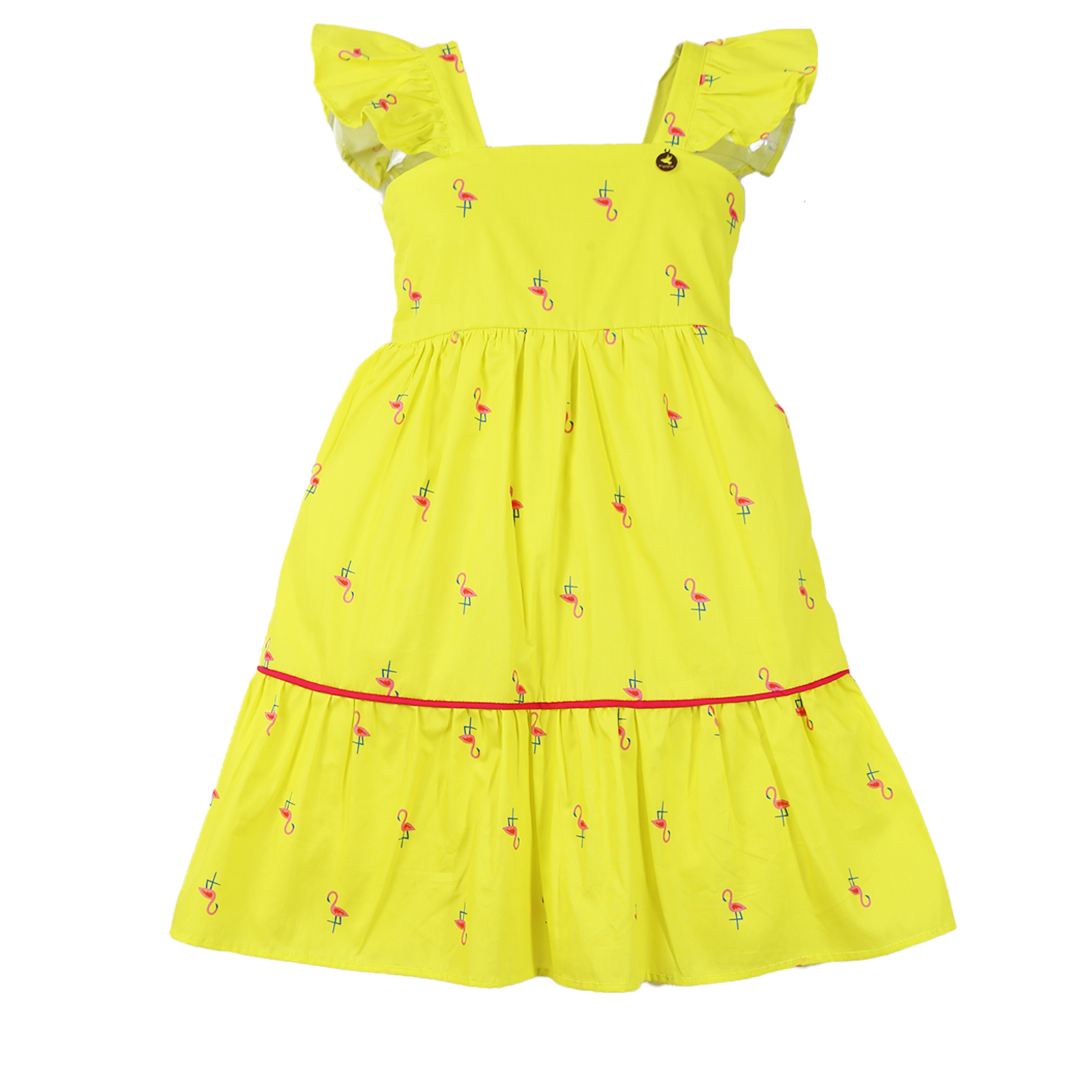Vestido infantil em tecido de algodão, decote reto, alça com babadinho, pala, saia franzida com babado e vivo embutido. Lastex nas costas. Feito com a nossa estampa exclusiva “FLAMINGO FUNDO AMARELO NEON”.