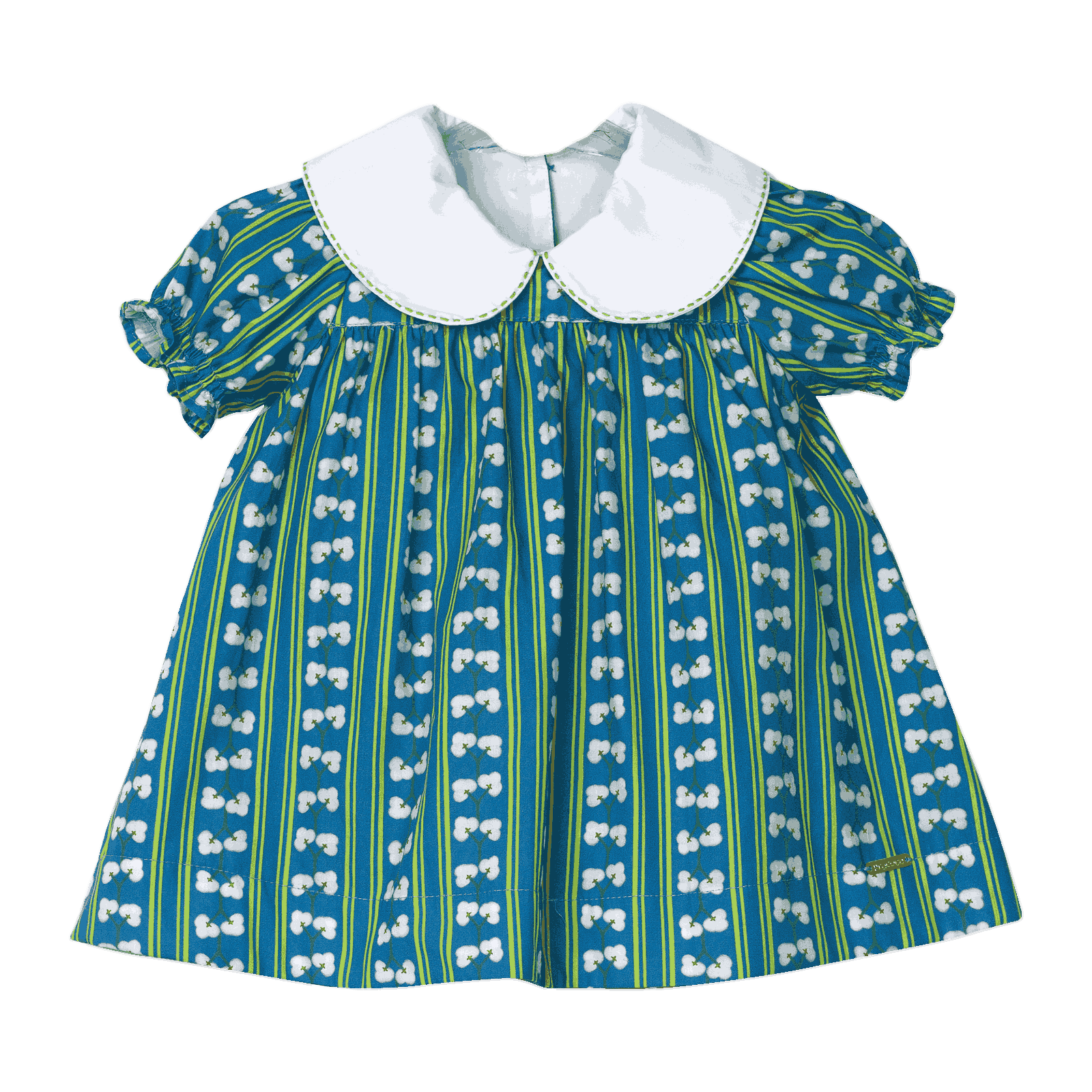 Vestido infantil em tecido de algodão, gola bebê, pala pequena franzindo e abrindo a roda do vestido, mangas fofas com lastex. Abotoamento nas costas, modelagem soltinha e confortável.
