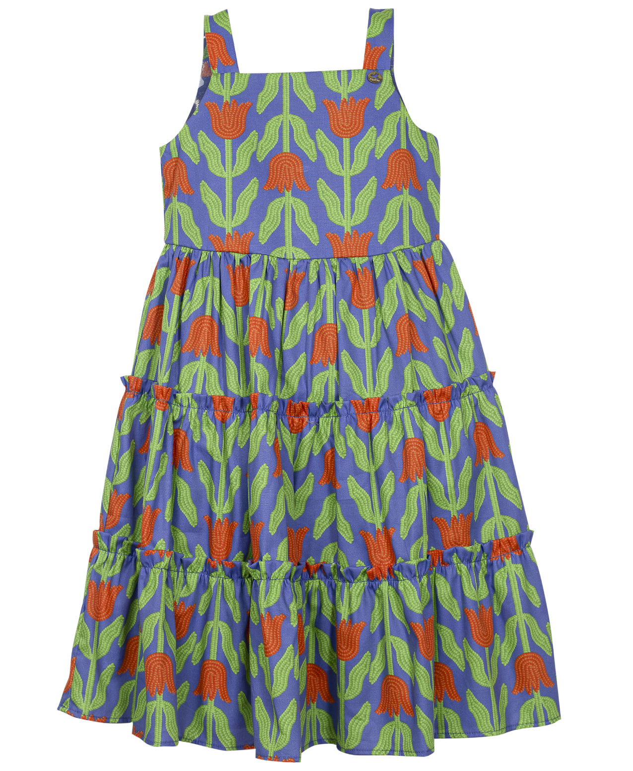 Vestido infantil em tecido de algodão, decote reto, alças, pala, saia com recortes franzidos, abotoamento nas costas. Feito com a nossa estampa exclusiva “FLOR DE MIÇANGA FUNDO AZUL”.