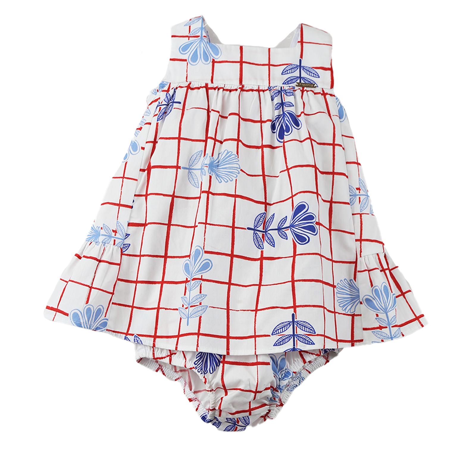 Vestido infantil em tecido de algodão, pala pequena, decote reto, modelagem ampla, recorte e babado lateral, abotoamento nas costas. Calcinha com elástico na cintura e entre pernas. Feito com a nossa estampa exclusiva “FLOR NAVE”.