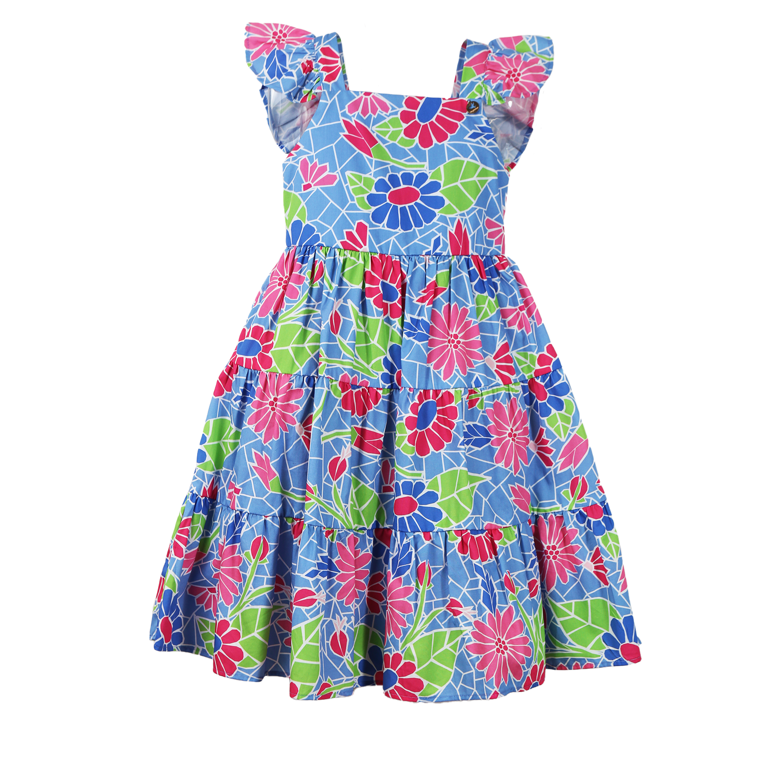 Vestido infantil em tecido de algodão, decote reto, alça com babado, pala, saia com recortes franzidos, lastex e laço nas costas. Feito com a nossa estampa exclusiva “MOSAICO”.