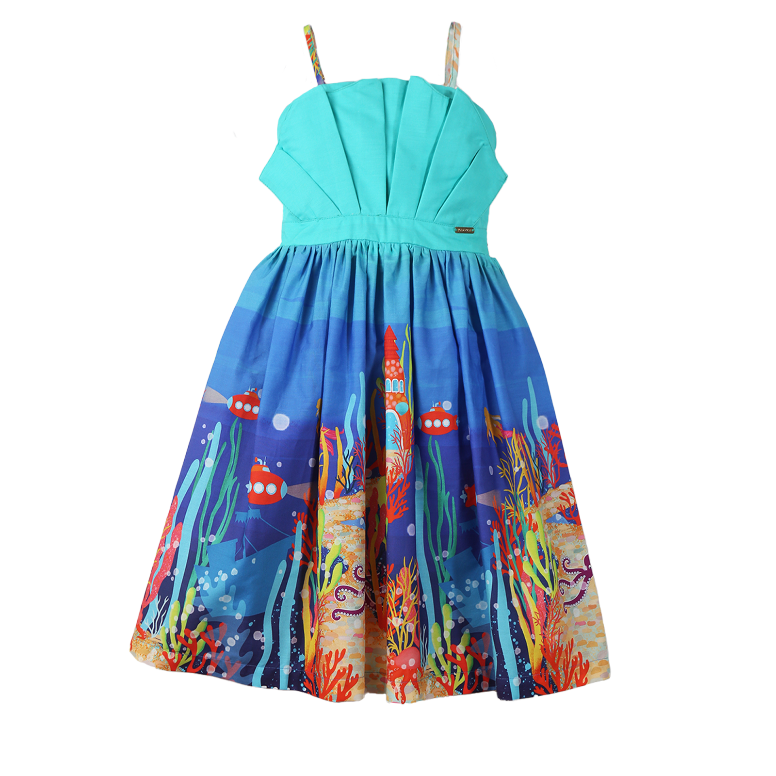 Vestido infantil em tecido de algodão, pala com detalhe de concha, alças com regulador, lastex nas costas. Feito com a nossa estampa exclusiva “BARRADO FUNDO DO MAR”.