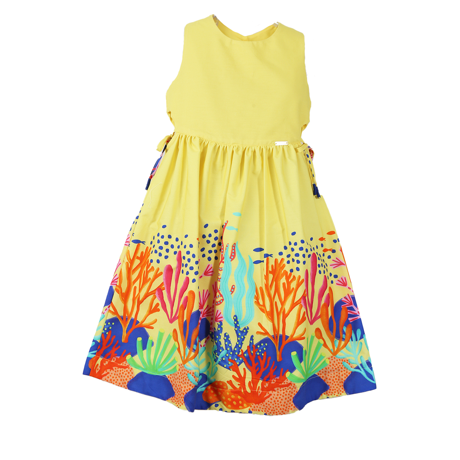 Vestido infantil em tecido de algodão, decote em U, pala marcando a cintura, saia franzida, decote nas laterais com amarração. Abotoamento nas costas. Feito com a nossa estampa exclusiva “BARRADO JARDIM DE ALGA FUNDO AMARELO”. A equipe de estilo e design da Precoce tem o cuidado de desenvolver modelos que permitam a criança ser livre para ser criança.
