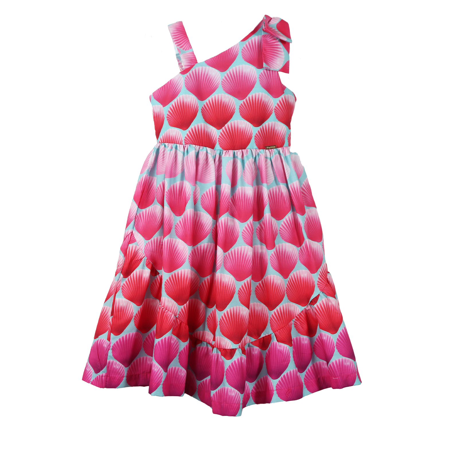 Vestido infantil em tecido de algodão, decote assimétrico, um ombro só com laço e alça, saia franzida e babado na barra. Abotoamento nas costas. Feito com a nossa estampa exclusiva “JARDIM DE CONCHAS”. A equipe de estilo e design da Precoce tem o cuidado de desenvolver modelos que permitam a criança ser livre para ser criança.