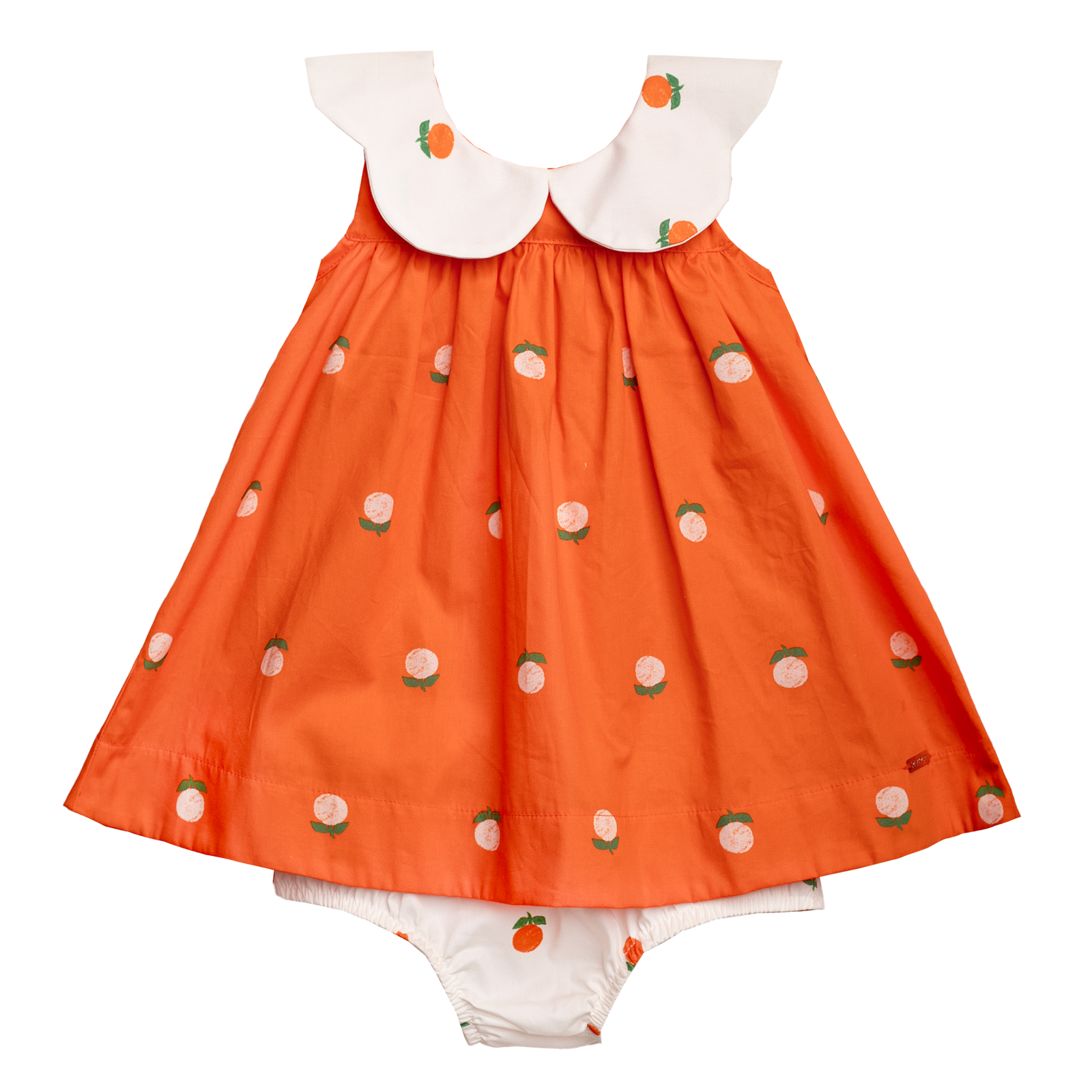Vestido infantil em tecido de algodão, gola bebe, decote em U, abotoamento nas costas. Calcinha com elástico na cintura e entre as pernas. Feito com a nossa estampa exclusiva “LARANJINHA”.