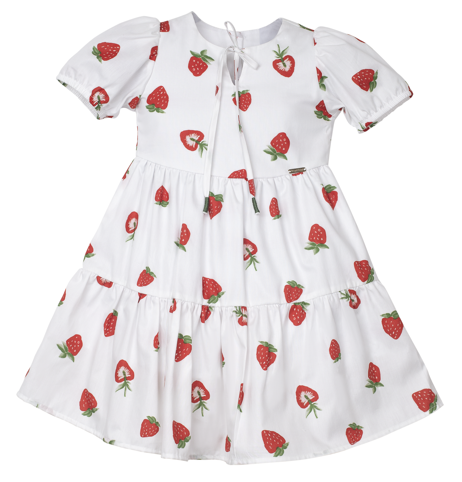 Vestido infantil em tecido de algodão,decote em U com amarração na frente, manga fofa, saia com recortes franzidos. Abotoamento nas costas. Feito com a nossa estampa exclusiva “MORANGO MENOR FUNDO BRANCO”.