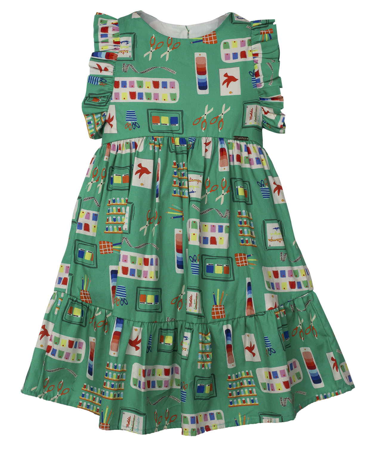 Vestido infantil em tecido de algodão, decote em U, babadinho na cava e na barra. Abotoamento nas costas. Feito com a nossa estampa exclusiva “PAINEL DE INSPIRAÇÃO FUNDO VERDE ”.