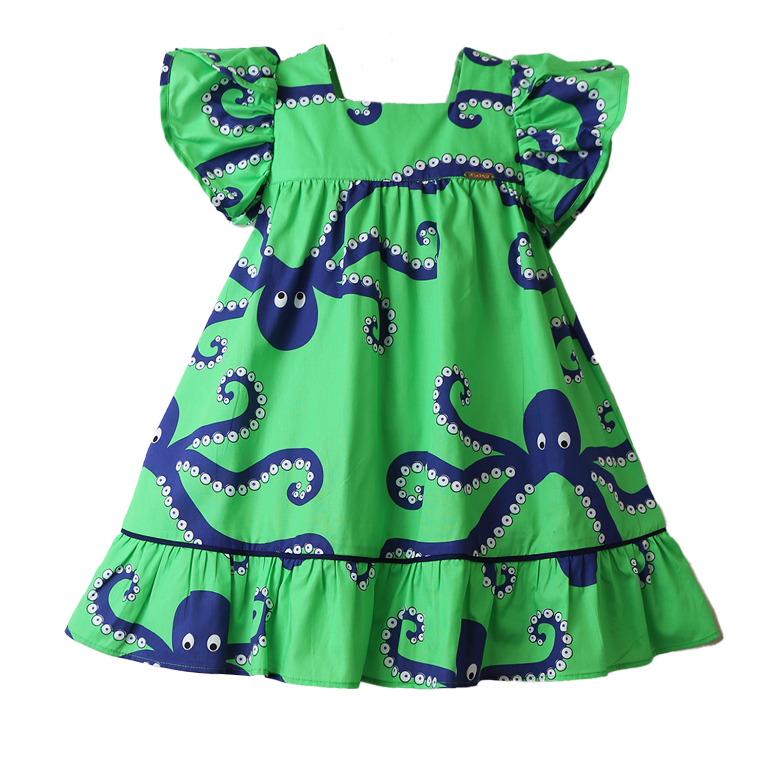 Vestido infantil em tecido de algodão, decote quadrado, pala pequena franzindo e abrindo a roda do vestido, mangas de babados, vivo embutido e babado na barra. Abotoamento nas costas. Feito com a nossa estampa exclusiva “POLVO GIGANTE”. A equipe de estilo e design da Precoce tem o cuidado de desenvolver modelos que permitam a criança ser livre para ser criança.