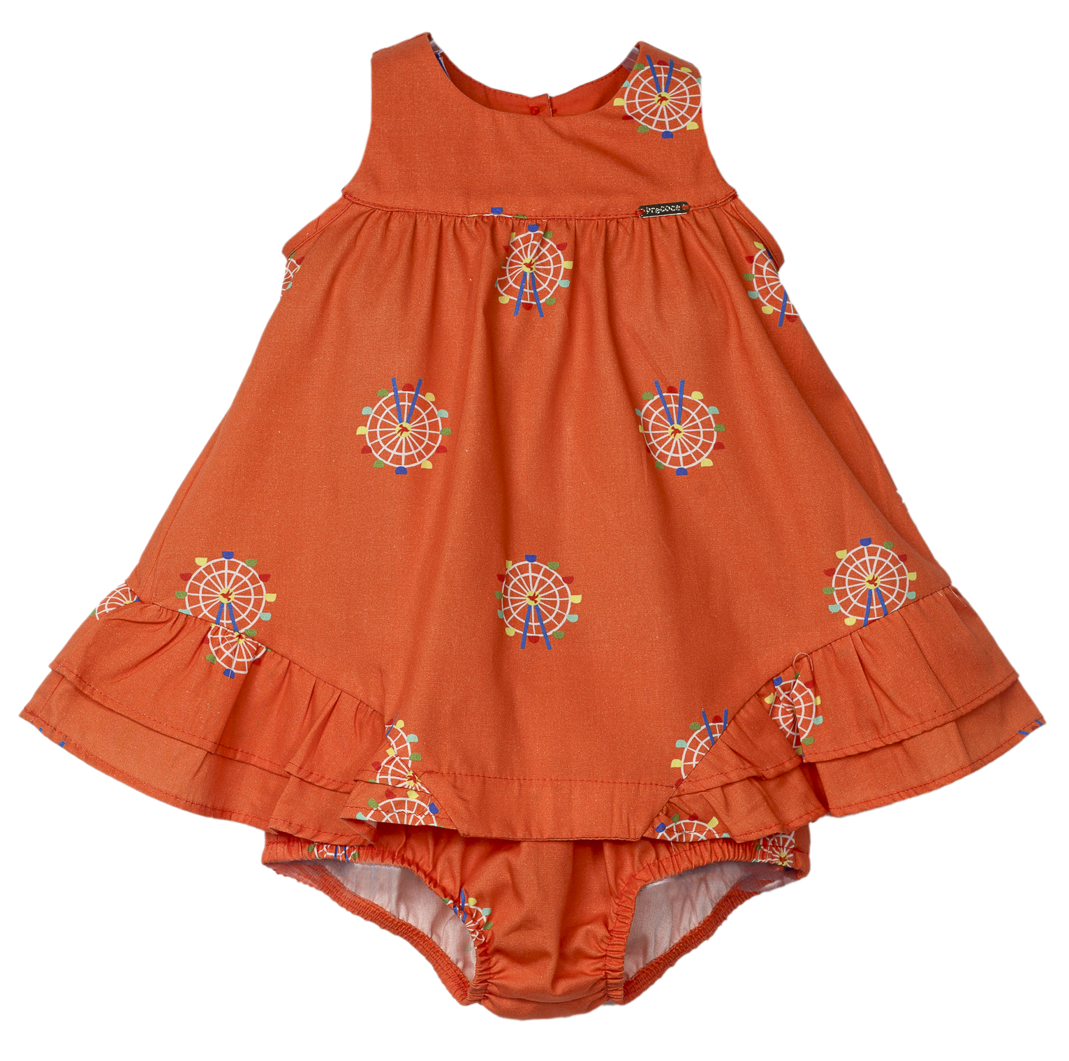 Vestido infantil em tecido de algodão, pala pequena abrindo a roda do vestido, babados nas laterais do vestido. Abotoamento nas costas.