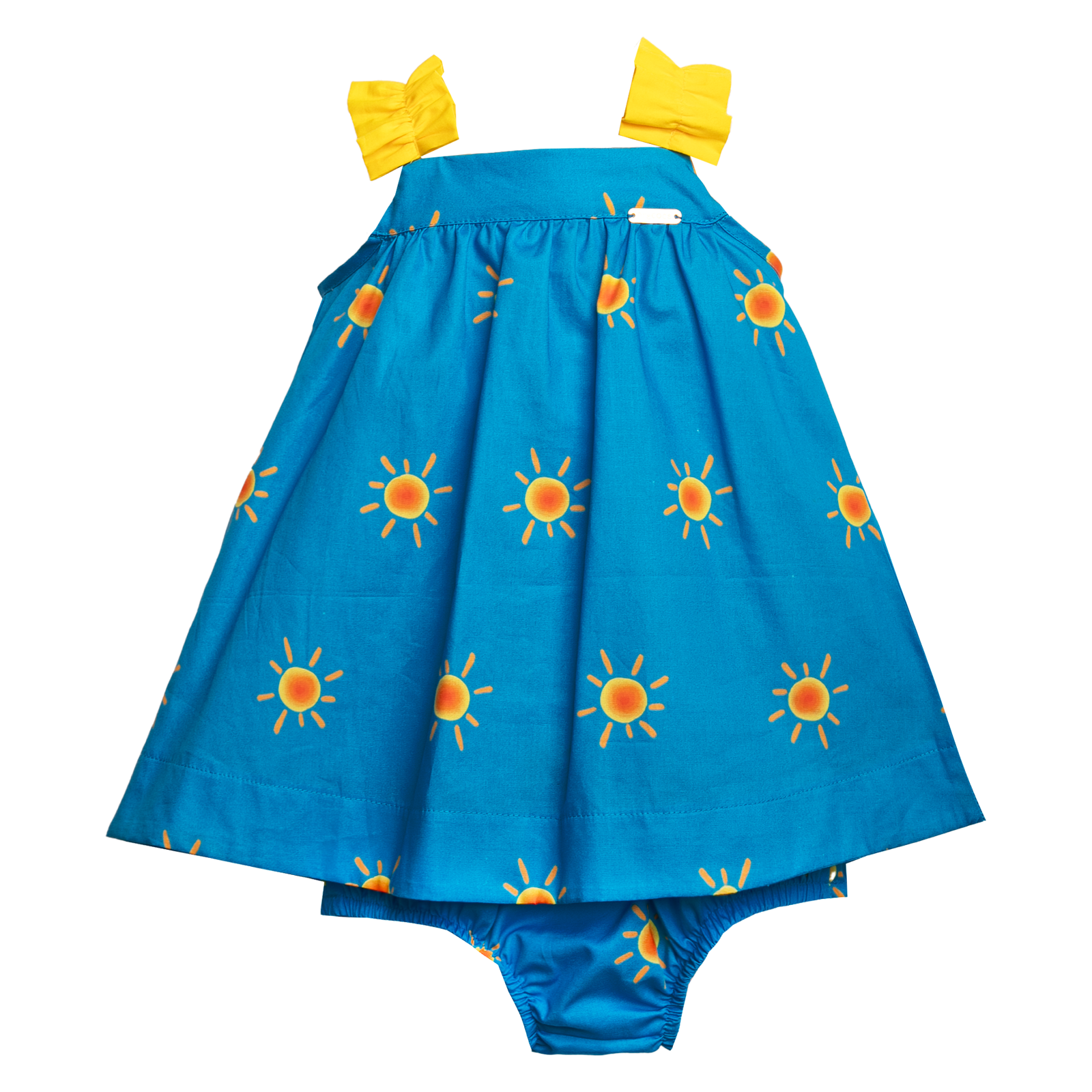 Vestido infantil em tecido de algodão, decote reto, alcinha com babadinho, palinha, vestido com recortes abrindo a roda, abotoamento nas costas. Calcinha com elástico na cintura e entre pernas, modelagem soltinha e confortável. Feito com a nossa estampa exclusiva “SOL FUNDO AZUL”