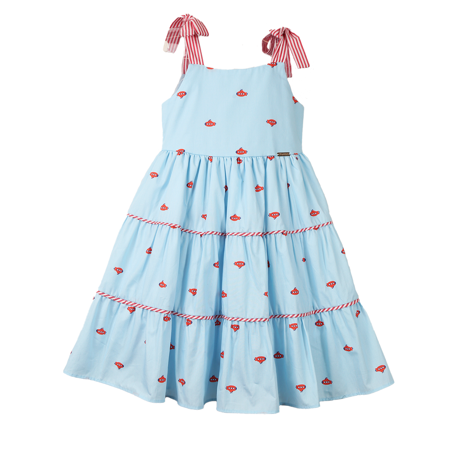 Vestido infantil em tecido de algodão, pala, alças com amarração, recortes franzidos com vivos embutidos. Abotoamento nas costas. Feito com a nossa estampa exclusiva “SUBMARINO FUNDO AZUL BEBÊ”.