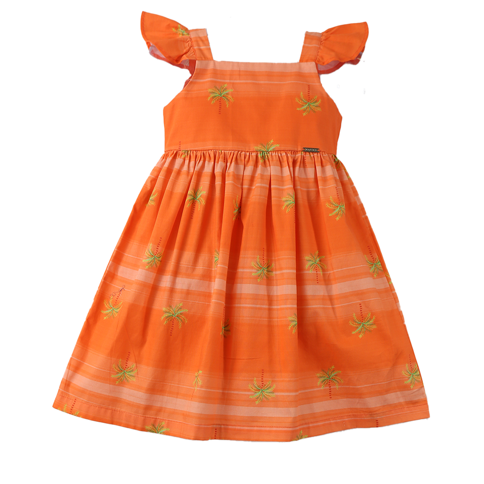 Vestido infantil em tecido de algodão, decote reto, alças com babadinhos, pala média franzindo e abrindo a roda do vestido. Abotoamento nas costas. Feito com a nossa estampa exclusiva “SUNSET FUNDO LARANJA”.