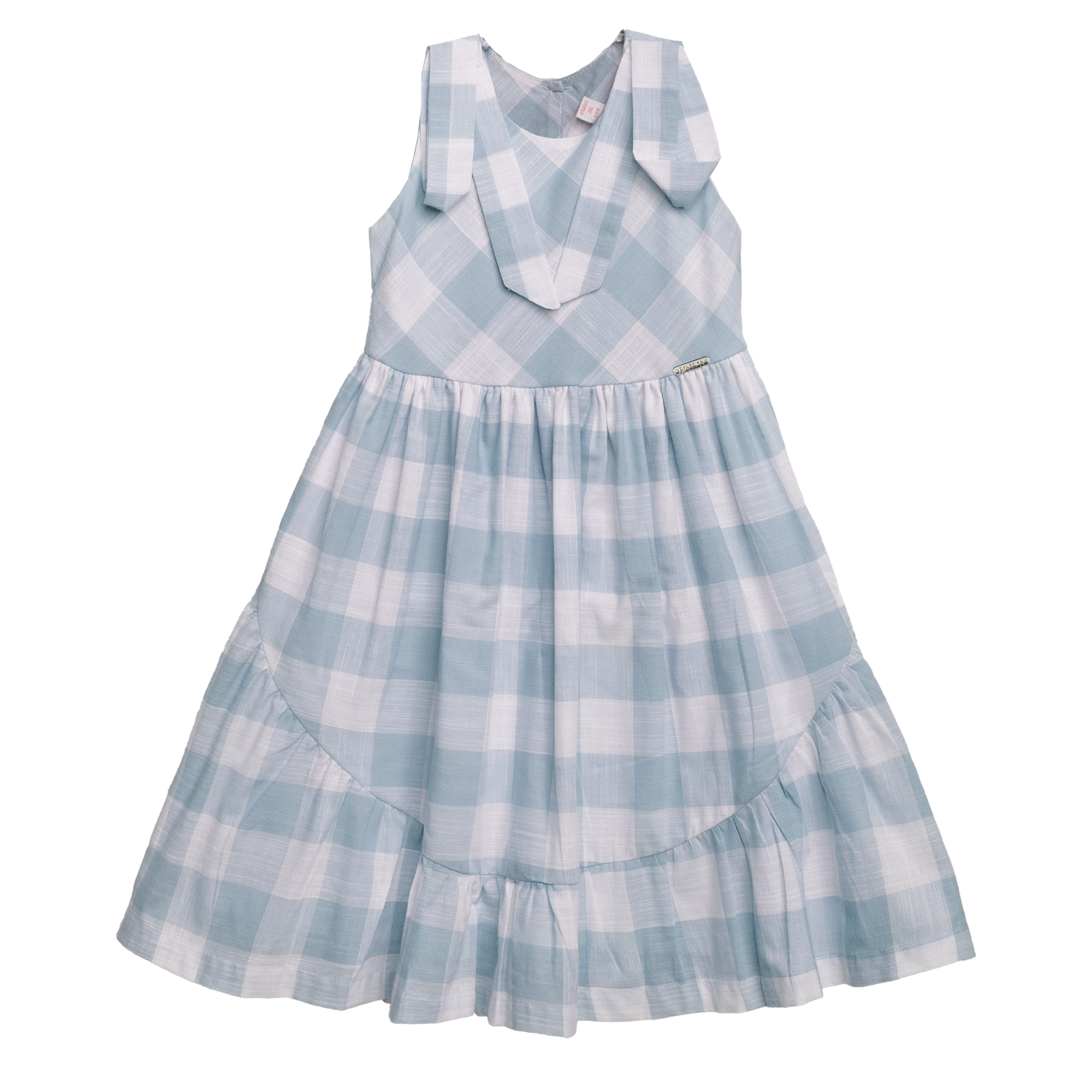 Vestido infantil em tecido de algodão, decote em U, pala e cintura marcada, laços nos ombros, saia rodada com recorte arredondado, fácil abotoamento nas costas.