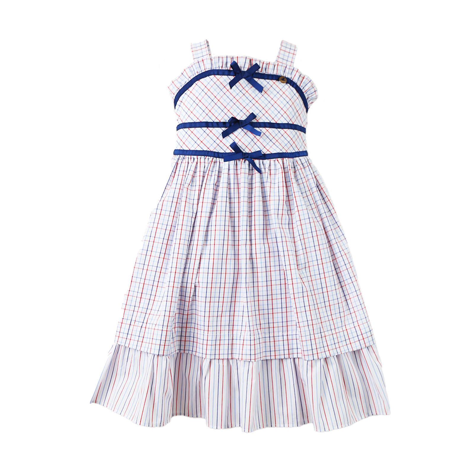 Vestido Xadrez infantil em tecido de algodão, decote com babadinho, alças, pala com laços e detalhes em gorgorão, saia franzida sobrepondo babado listrado na barra.