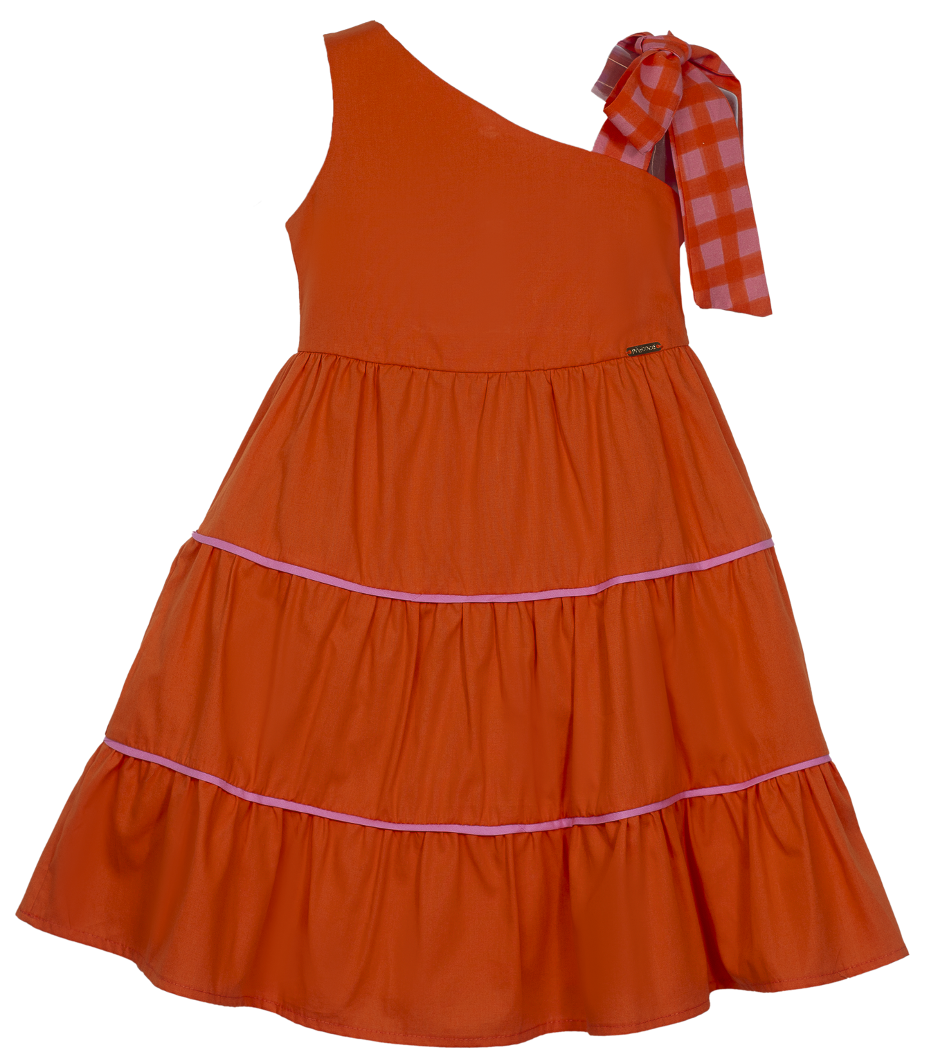 Vestido infantil em tecido de algodão, um ombro só com alça e amarração, vivos embutidos na saia.