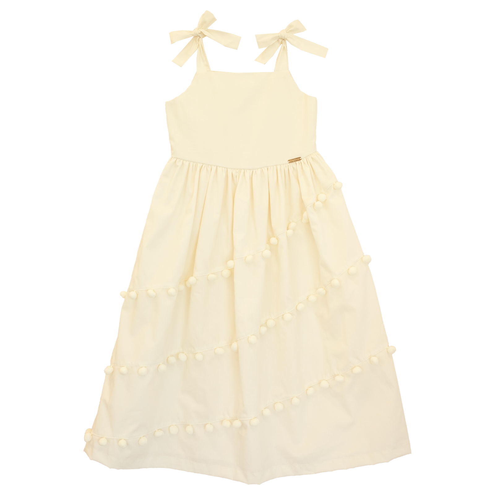 Vestido infantil em tecido de algodão, decote reto, alças de amarrar, saia franzida com recortes assimétrico e detalhes de pompom nos recortes. Abotoamento nas costas.