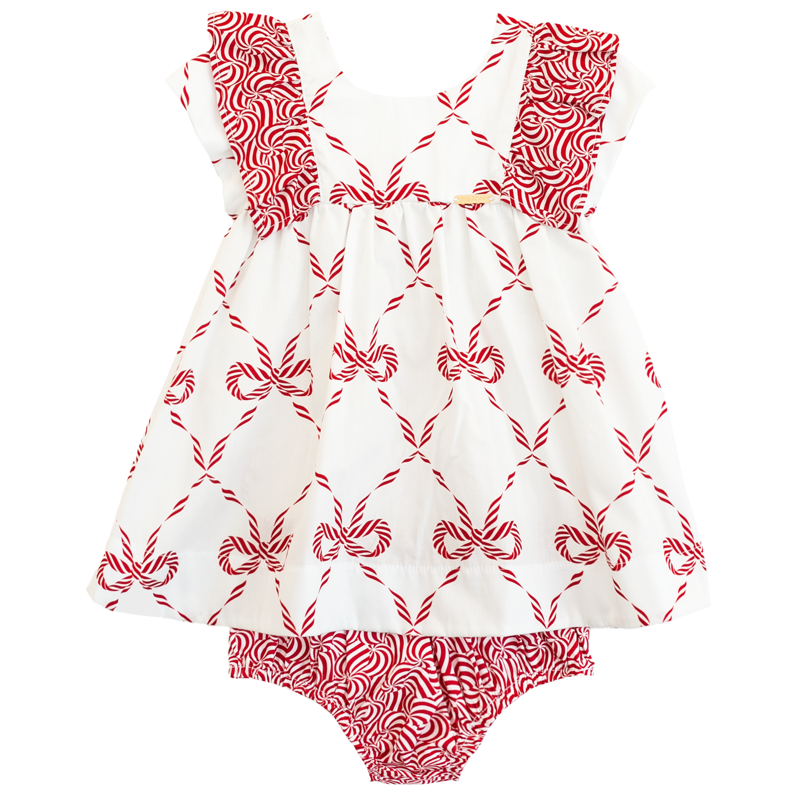 Vestido infantil em tecido de algodão, decote em U, pala com babadinho embutido nas laterais, modelagem soltinha e confortável, abotoamento nas costas. Calcinha com elástico na cintura e entre as pernas. Feito com a nossa estampa exclusiva “LAÇO CANDY CANES VERMELHO FUNDO BRANCO”.