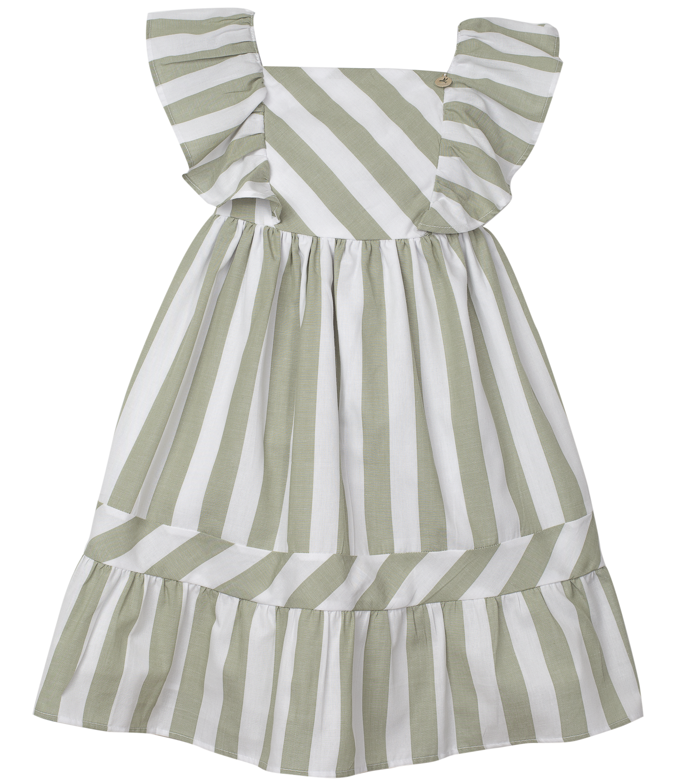 Vestido infantil em tecido de algodão, decote reto, pala com babado embutido nas laterais, saia rodada com recorte na barra, abotoamento nas costas.
